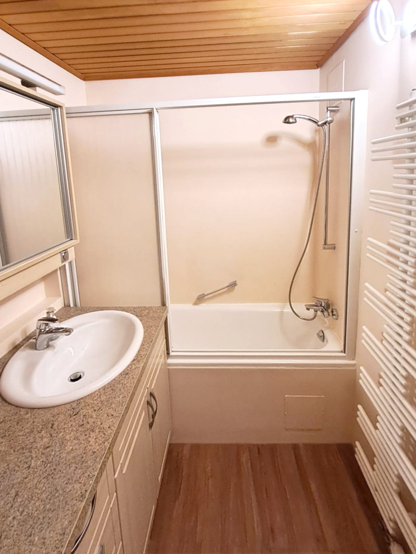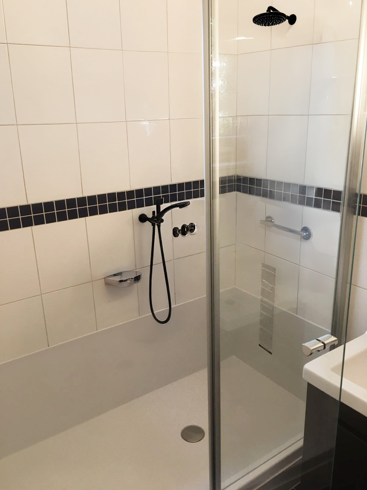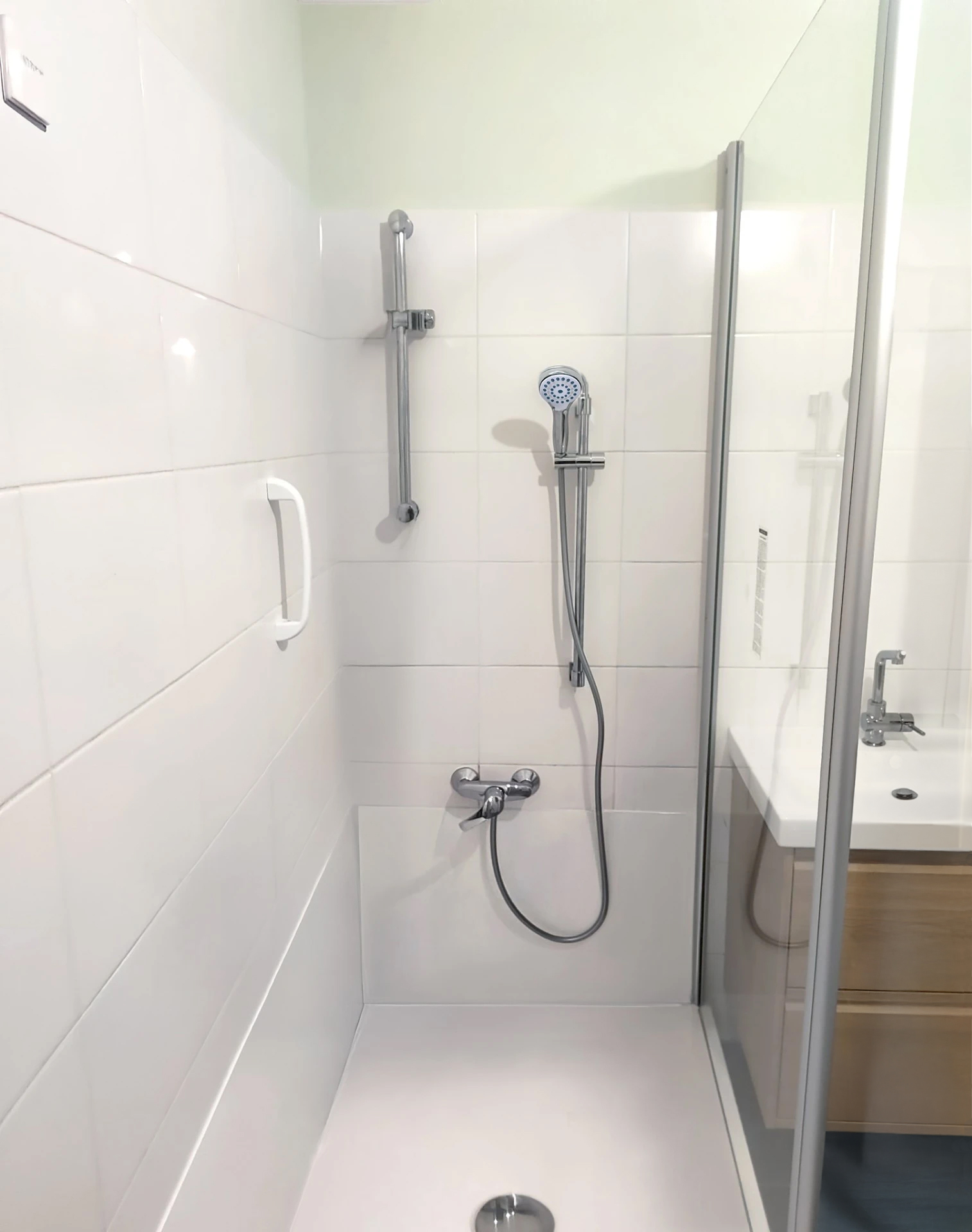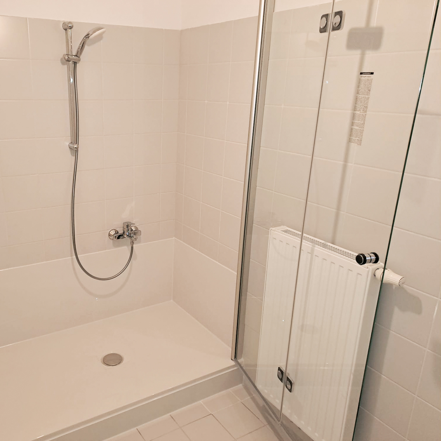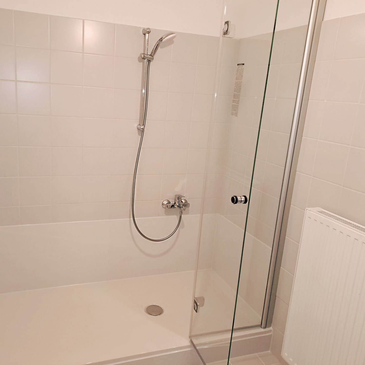 Duschkabine mit extra breiter Schiebetür und verkleidetem Sockel